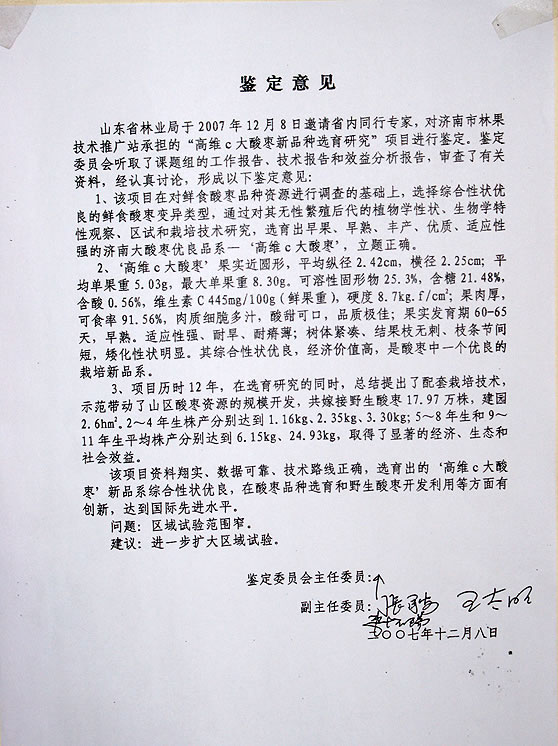 济南脆酸枣鉴定书